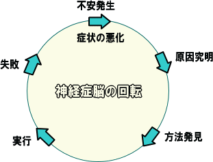神経症ではストレスを受けると、心に神経症円盤を回転するエネルギーが発生する。神経症円盤が回転し始めると、不安の原因解明とその対策への努力が止まらなくなり、円盤の回転は更に加速する。一度この生き方が始まると神経症円盤の回転停止は難しく、多くの人は神経症を長く経験します。故に神経症を治しの難しい心の障害とする。